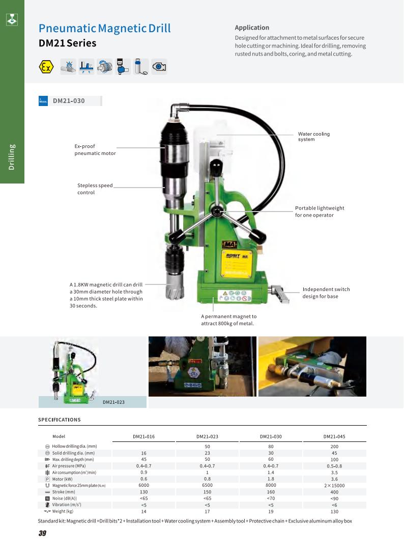 Model | Max. Hollow drill dia. | Max. spiral drill dia. | Max. drilling depth | Working pressure | Air consumption | Power | Mag. force | Stroke | Noise level | Vibration level | Weight |